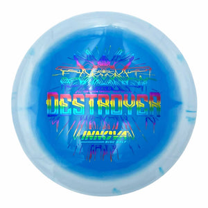 The Destroyer is a very fast stable long distance driver. This disc is much like a faster Wraith, but with a little more high and low speed stability. Great disc for sidearm throwers and those with lots of power. Can handle headwinds and throws with off axis torque.